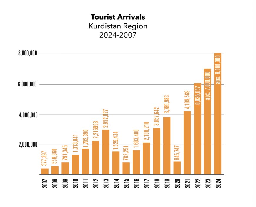 Li gorî statîstîkên fermî, di sala 2007 an de tenê 377,000 geştiyar serdana Herêma Kurdistanê kirine, lê ev hejmar di sala 2024 an de gihîştiye 8 mîlyonan, ku ev yek bi giranî encama girîngiya stratejîk a hikûmeta herêmê daye ku ji bo pêşxistina projeyên geştiyariyê kirine.