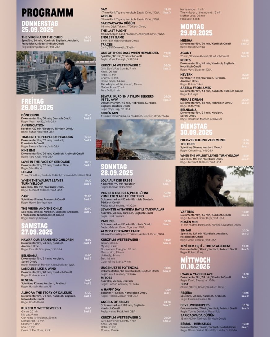 Di bernameya festîvalê de dê cîh ji fîlmên metrajdirêj, kurtefîlm, belgefîlm û fîlmên anîmasyonê re hebe, ku her yek ji wan dê çîrokên ji dil û hişmendiyên kûr ên gelê Kurd bîne ser ziman. Temaşevan dê derbasî cîhanên cihêreng bibin; ji dîmenên çiyayên Kurdistanê heta kolanên bajaran ên diyasporayê, ji berxwedan û êşan heta hêvî û evînan. Fîlmên ku dê bên nîşandan, dê bîr û bawerî, berxwedan, evîn, û rastiyên civakî yên gelê Kurd bi awayekî hunerî bînin ziman.