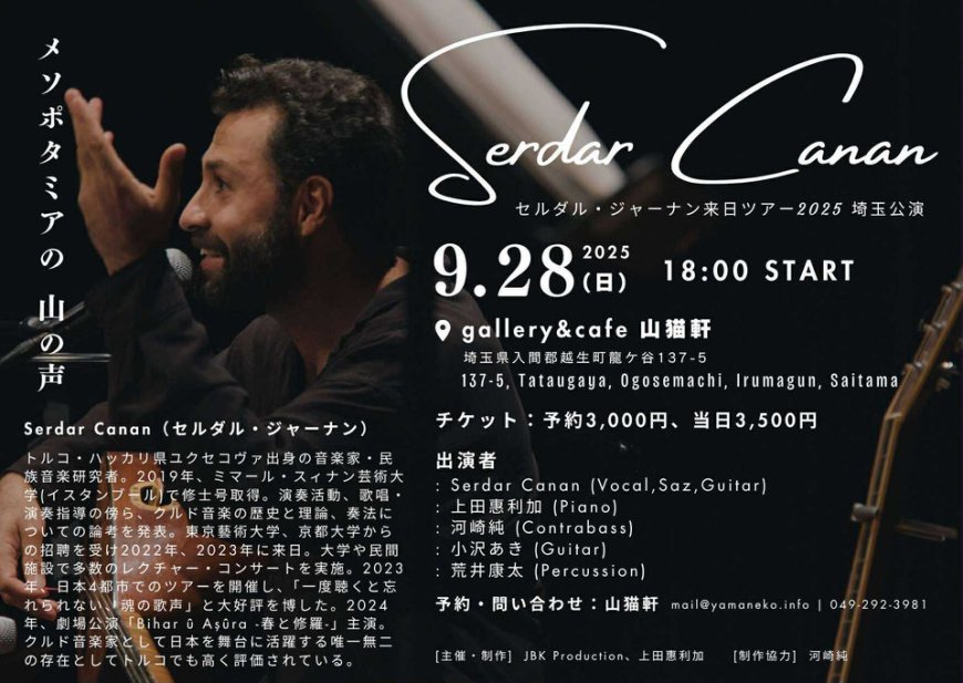 Di koncerta Saitamayê de, Serdar Canan dê bi hunermendên jêhatî re bibe yek, di nav de Erika Ueda (piyano), Jun Kawasaki (kontrabas), Aki Ozawa (gîtar), û Kōta Arai (perkûsyon). Ev hevkarî soz dide ku dengê bêhempa yê Canan û bandora muzîka Kurdî bi guhdarên Japon re bide nasîn.