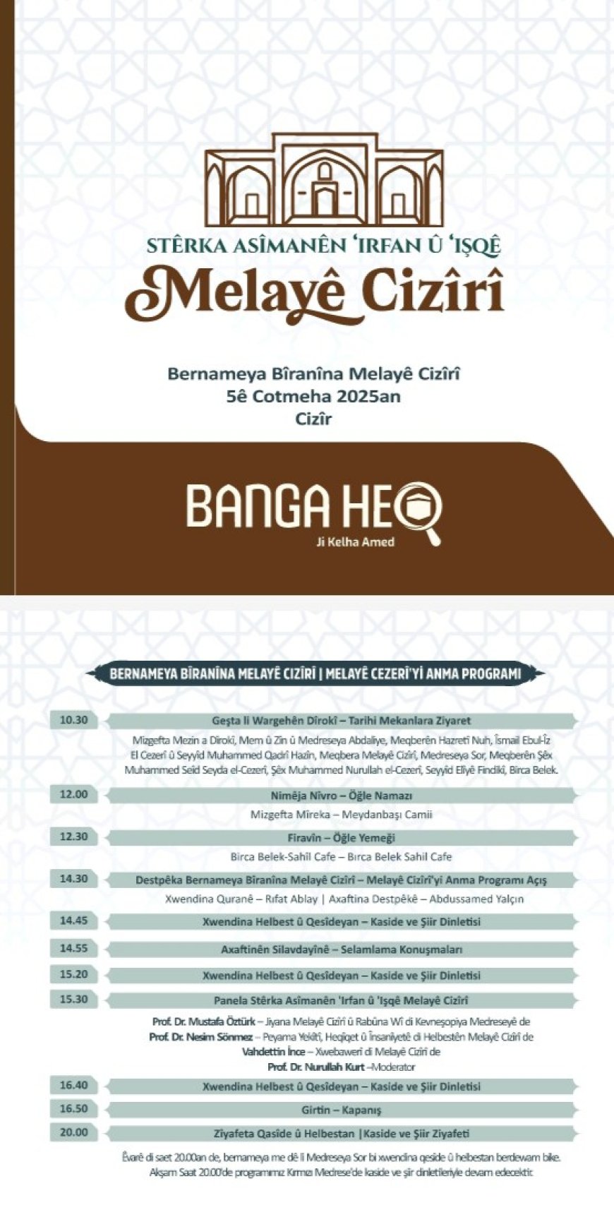 Cizîr - Kurdistan: Sibê 5ê Cotmeha 2025an, li Cizîra Botan, bajarê dîrokî yê ku li ser peravên Dîcle hatiye avakirin, bibe mêvandara bernameyeke bîranînê ya taybet ji bo yek ji stêrkên herî geş ên wêjeya Kurdî û îrfana Îslamî, Melayê Cizîrî. Di bin sernavê balkêş "STÊRKA ASÎMANÊN ÎRFAN Û IŞQÊ", ev bernameya ku ji aliyê "BANGA HEQ Ji Kelha Amed" ve tê amadekirin û organîzekirin, armanc dike ku mîrata wî ya bêhempa bîne bîra gel û girîngiya wî di cîhana îroyîn de careke din destnîşan bike.